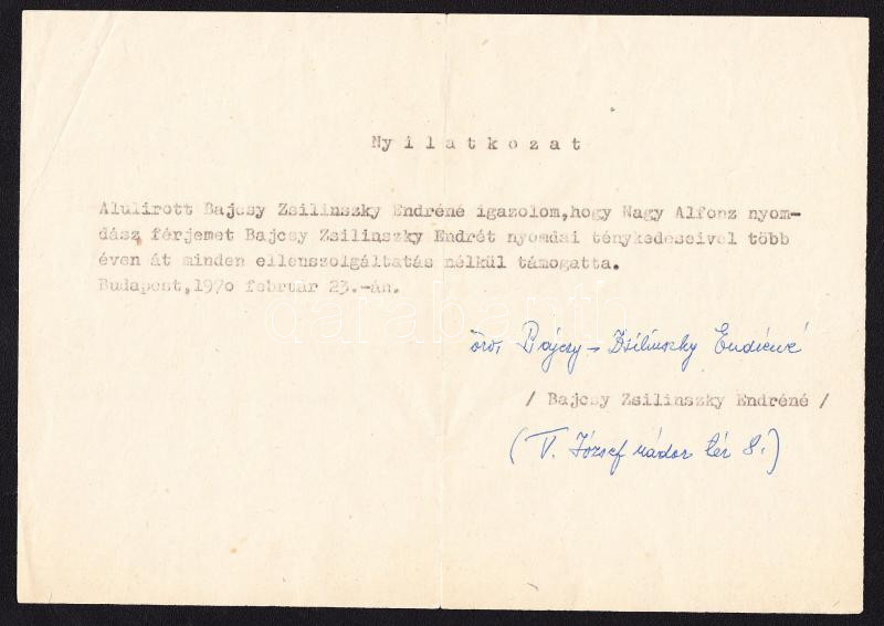 Beschreibung: 1970 Bajcsy Zsilinszky Endréné aláírása nyilatkozaton