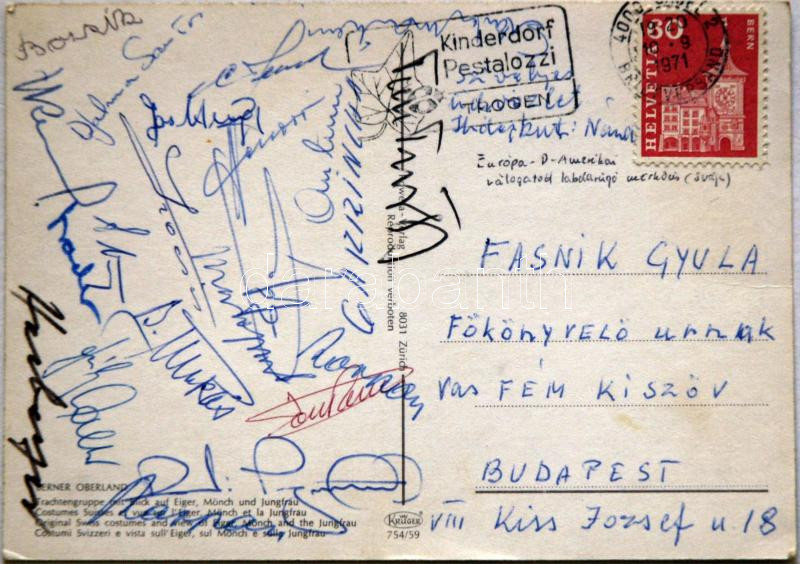 Beschreibung: 1971 Európai-dél-amerikai válogatott labdarúgó mérkőzés csapattagjainak aláírása képeslapon, benne magyarok is
