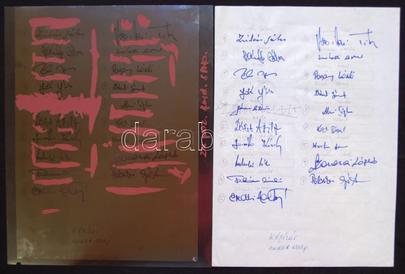 Beschreibung: Magyar labdarúgó válogatott tagjainak aláírása papírlapon reklámanyaghoz nyomdai előkészítő filmmel