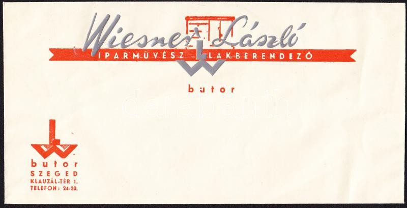 Wiesner László lakberendező díszes dombornyomott boríték https://www.darabanth.com/de/155-Fernauktion/155.0/Andere-Sammelgebiete/Werbungen~5000315/Wiesner-Laszlo-lakberendezo-diszes-dombornyomott-boritek~II486488