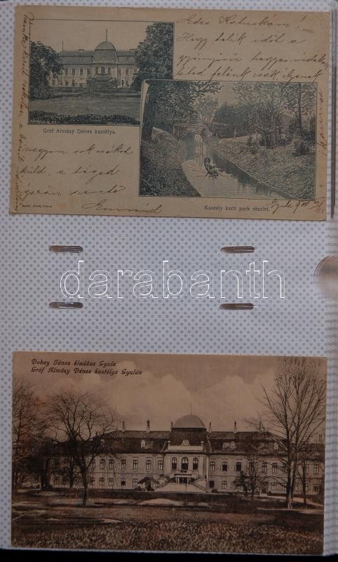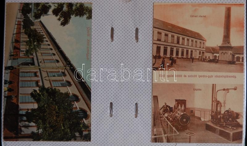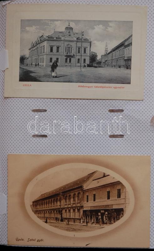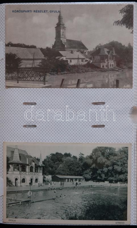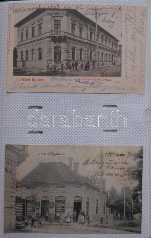 GYULA képeslap gyűjtemény, 144 db legnagyobbrészt háború előtti városképes lap lithokkal, rengeteg ritka, érdekes, értékes lappal. Hozzá az "Üdvözlet Gyuláról" című, képeslapokból összeállított könyv, mely nagyrészt a gyűjteményben szereplő lapok felhasználásával készült. Érdemes megnézni!!