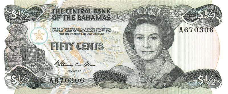 Bahamas 1974 (1984). 1/2 Dollar ... https://www.darabanth.com/de/155-Fernauktion/155.0/Numismatik/Auslandische-Banknoten~5000350/Bahama-szigetek-1974-1984-12USD-TI-3Cbr3EBahamas-1974-1984-12-Dollar-CUnc~II480267