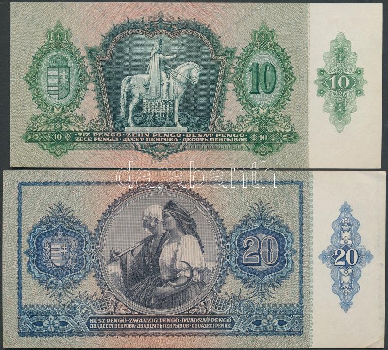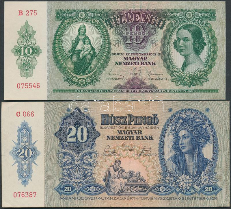 1936. 10P + 1941. 20P T:I,II https://www.darabanth.com/de/155-Fernauktion/155.0/Numismatik/Ungarische-Banknoten~5000346/1936-10P-plus-1941-20P-TI-II~II485968