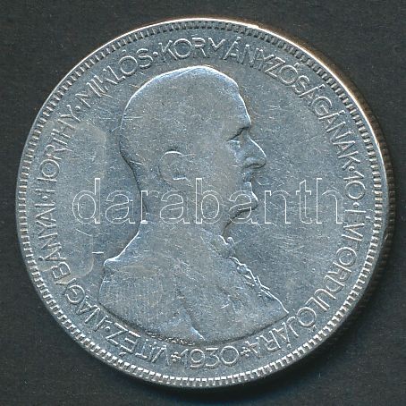 1930. 5P Ag "Horthy jobbra" T:3 https://www.darabanth.com/de/155-Fernauktion/155.0/Numismatik/Ungarische-Munzen~5000347/1930-5P-Ag-Horthy-jobbra-T3~II483130