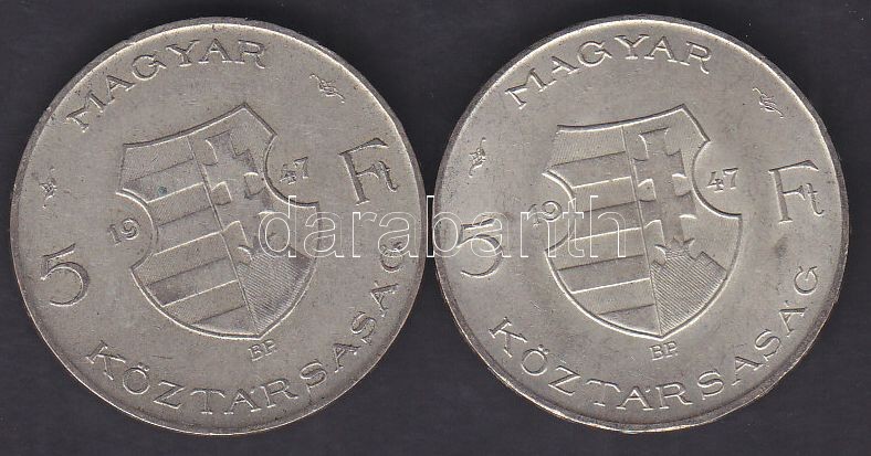 1947. 5Ft Ag "Kossuth" (2x) T:2-,3 https://www.darabanth.com/de/155-Fernauktion/155.0/Numismatik/Ungarische-Munzen~5000347/1947-5Ft-Ag-Kossuth-2x-T2-3~II483275