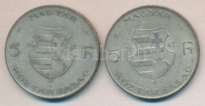 1947. 5Ft Ag "Kossuth" (2x) T:3 https://www.darabanth.com/de/155-Fernauktion/155.0/Numismatik/Ungarische-Munzen~5000347/1947-5Ft-Ag-Kossuth-2x-T3~II483245