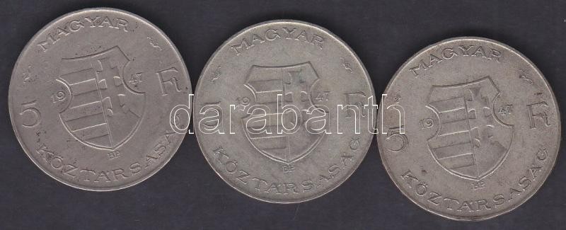 1947. 5Ft Ag "Kossuth" (3x) T:3 https://www.darabanth.com/de/155-Fernauktion/155.0/Numismatik/Ungarische-Munzen~5000347/1947-5Ft-Ag-Kossuth-3x-T3~II483276