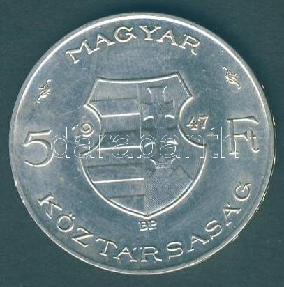 1947. 5Ft "Kossuth" Ag T:2 Tanúsítvánnyal https://www.darabanth.com/de/155-Fernauktion/155.0/Numismatik/Ungarische-Munzen~5000347/1947-5Ft-Kossuth-Ag-T2-Tanusitvannyal~II484128