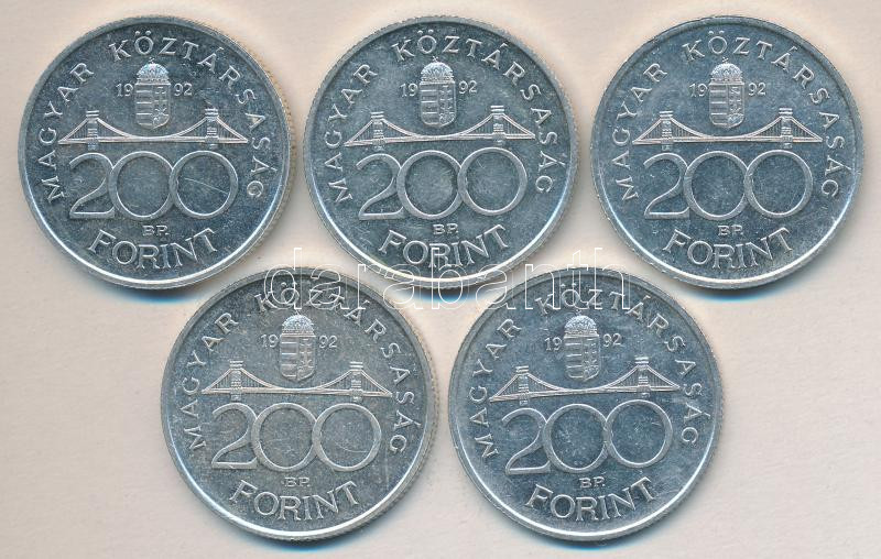 1992. 200Ft Ag "MNB" (5x) T:2+,2 https://www.darabanth.com/de/155-Fernauktion/155.0/Numismatik/Ungarische-Munzen~5000347/1992-200Ft-Ag-MNB-5x-T2plus-2~II486497