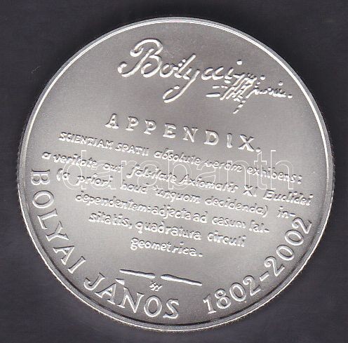 2002. 3000Ft Ag "Bolyai János" T:BU Csak 3000db! https://www.darabanth.com/de/155-Fernauktion/155.0/Numismatik/Ungarische-Munzen~5000347/2002-3000Ft-Ag-Bolyai-Janos-TBU-Csak-3000db~II483327