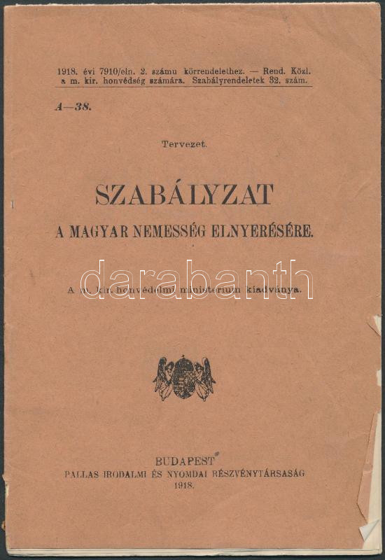 1918 Szabályzat a magyar nemesség elnyerésére, Pallas Irodalmi és Nyom... https://www.darabanth.com/de/156-Fernauktion/156.0/Andere-Sammelgebiete/Drucksachen~1000016/1918-Szabalyzat-a-magyar-nemesseg-elnyeresere-Pallas-Irodalmi-es-Nyomdai-Rt-a-M-kir-Honve~II491519