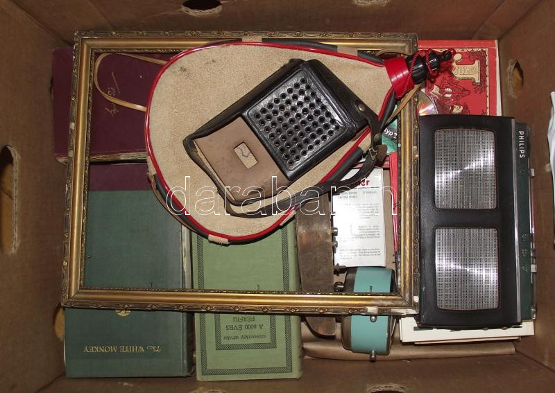Beschreibung: Nagy vegyes bolhapiac tétel: képkeret, rádió, ivótömlő, ébresztőóra, 1945 előtti vegyes könyvek, bakelitlemez tartó