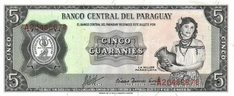 Paraguay ... https://www.darabanth.com/de/156-Fernauktion/156.0/Numismatik/Auslandische-Banknoten~1000135/Paraguay-1952-5G-piros-szeria-TI-plus-Szurinam-1988-25G-TI-3Cbr3EParaguay-1952-5-Guaranies-red-se~II491135