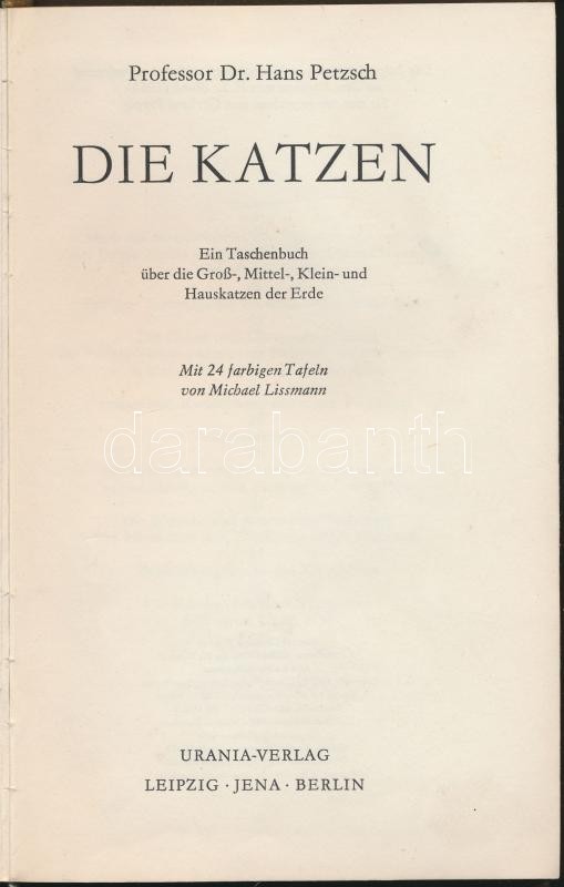 Hans Petzsch: Die Katzen. Urania- Verlag, Liepzig Jena Berlin, 1963 . ... https://www.darabanth.com/de/157-Fernauktion/157.0/Andere-Sammelgebiete/Bucher-Andere-Sprachen~500024/Hans-Petzsch-Die-Katzen-Urania-Verlag-Liepzig-Jena-Berlin-1963-190p-Vaszon-kotesben-szC3~II494774