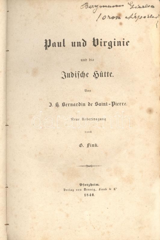 Paul und Virginie und die Indische Hütte. Verlag von Dennig, 1840. sok acél metszetettel illusztrált félbőr kötésben német nyelven gót betűkkel.A gerinc kicsit sérült cca. 370 p./