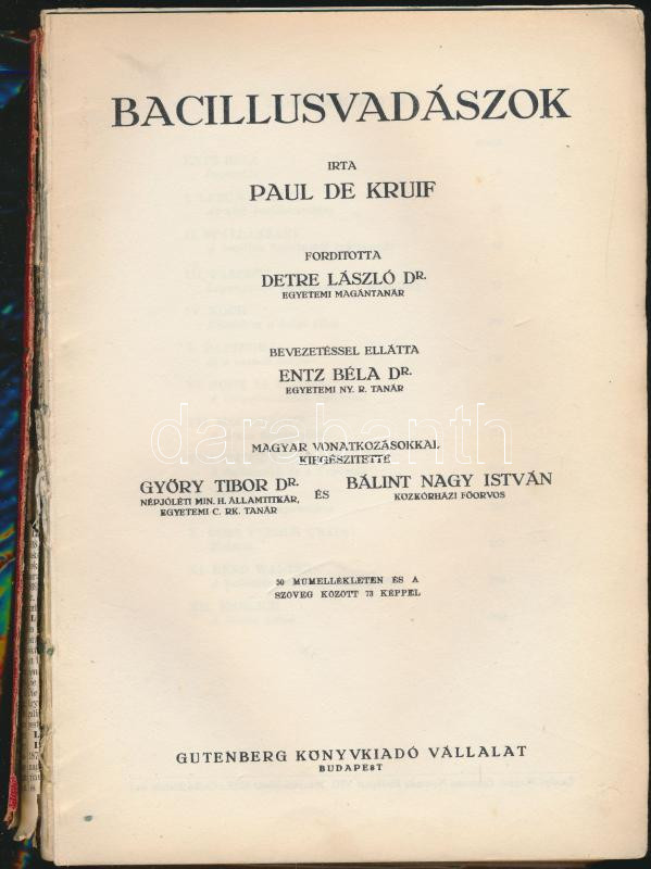 Paul De Kruif: Bacilusvadászok. Gutenberg Könyvkiadó Vállalat , Budapest. 334p. Orvosi szakkönyv.A gerinc rossz állapotban, aranyozott dombornyomattal, a borító elvált.
