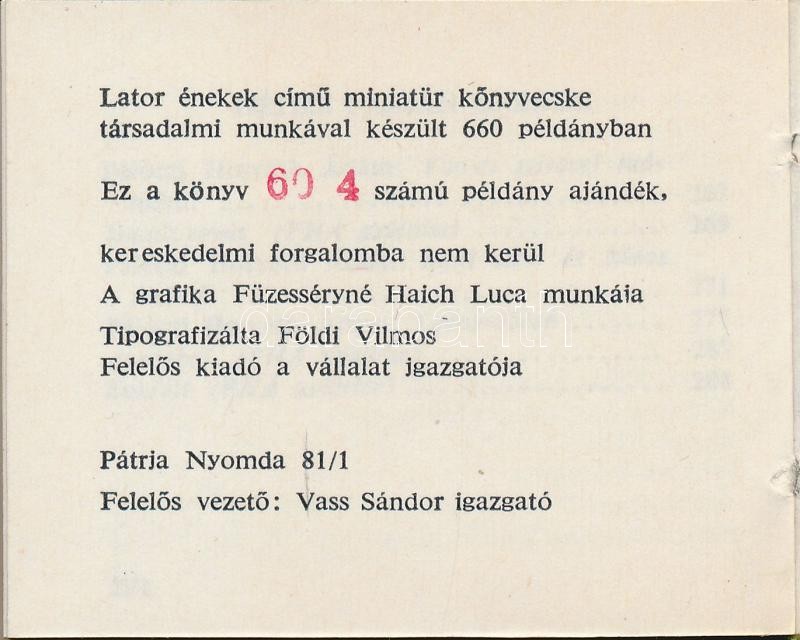 Beschreibung: Lator énekek, magyar költemények XVI-XVII. századból. Pátria Nyomda Budapest, 1981 Színes illusztrációkkal, sorszámozott minikönyv