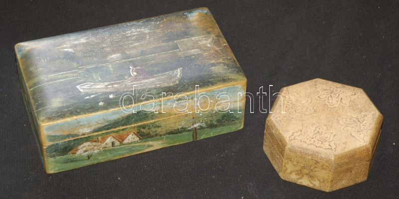 Beschreibung: 2db fa ládika: kézzel festett (18x11x6cm), faragott (9x9x4cm)
