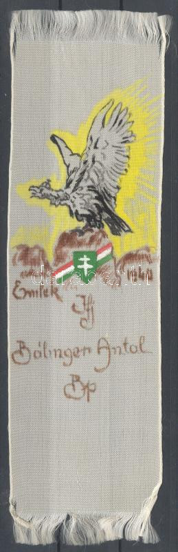 Turulmadarat ábrázoló irredenta-hatású festett selyem könyvjelző 8x18 ... https://www.darabanth.com/de/157-Fernauktion/157.0/Andere-Sammelgebiete/Flohmarkt~500112/Turulmadarat-abrazolo-irredenta-hatasu-festett-selyem-konyvjelzo-8x18-cm~II495953