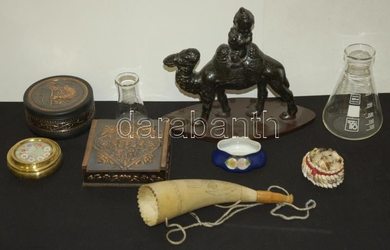 Beschreibung: Vegyes bolhapiac tétel fafaragványokkal, gyógyszeres üvegekkel és egyéb érdekességekkel.