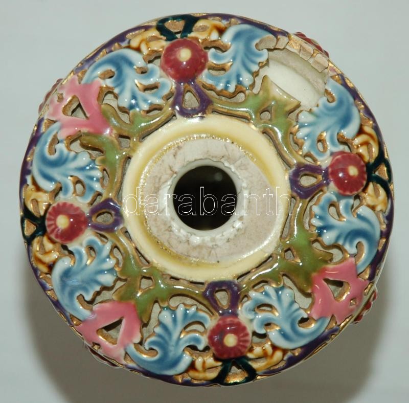 Beschreibung: cca 1875 Antik, kézzel festett, aranyozott, áttört Zsolnay urnaváza máz alatti kék jelzéssel. (alján lepattanás, teteje hiányos) /