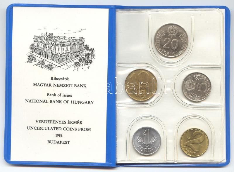 1986. 2f-20Ft 10db klf érmés forgalmi sor kék műbőrtokban T:1 https://www.darabanth.com/de/157-Fernauktion/157.0/Numismatik/Ungarische-Munzen~500122/1986-2f-20Ft-10db-klf-ermes-forgalmi-sor-kek-mubortokban-T1~II494871