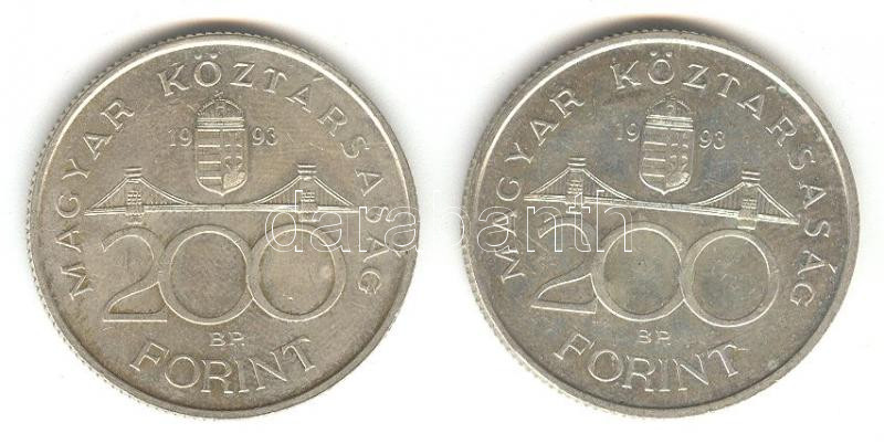 1993. 200Ft Ag "MNB" (2x) T:2,2- https://www.darabanth.com/de/157-Fernauktion/157.0/Numismatik/Ungarische-Munzen~500122/1993-200Ft-Ag-MNB-2x-T2-2-~II494193