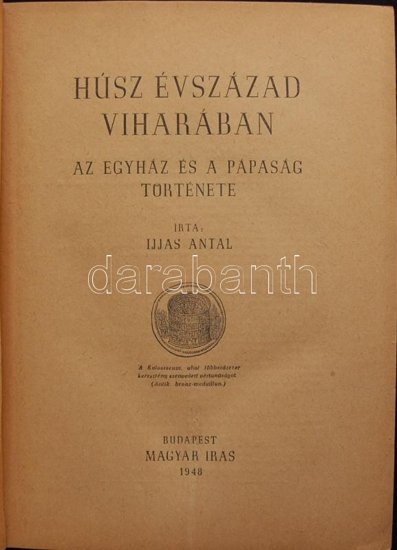 Ijjas Antal: Húsz évszázad viharában - az egyház és a pápaság története, Magyar Írás Kiadó, Bp., 1948., kiadói félvászon kötésben, a borítón apró sérülések, pár szövegközti ábrával