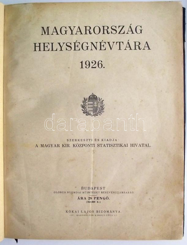 1926 Magyarország helységnévtára https://www.darabanth.com/de/158-Fernauktion/158.0/Andere-Sammelgebiete/Bucher-Sonstige-Raritaten~194/1926-Magyarorszag-helysegnevtara~II503524