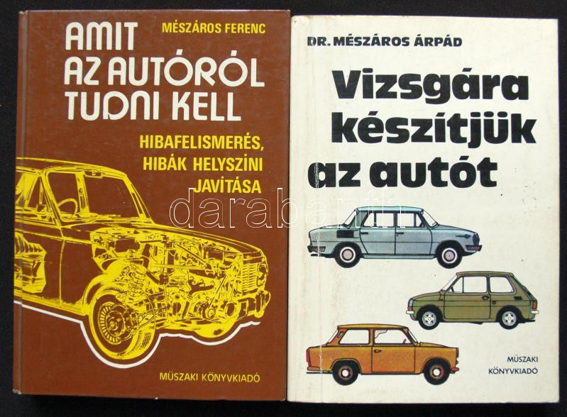 2 db autós könyv: Dr. Mészáros Árpád: Vizsgára készítjük az autót. Műszaki kiadó, 1980.+ Mészáros Ferenc: AMit az autóról tudni kell- Hibafelismerés, hibák helyszíni javítása. Műszaki Könyvkiadó, 1984.