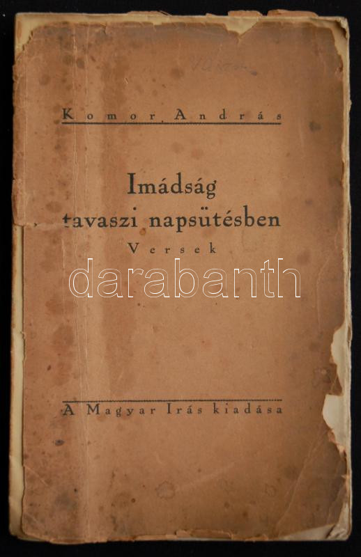 Komor András: Imádság tavaszi napsütésben. Versek. (Kelő Nap Sorozat 4.) Aláírt, számozott (437/500) példány. A könyvet díszítő linóleummetszet Walleshausen Zsigmond munkája. (Megviselt borítóval, fűzés szétvált)