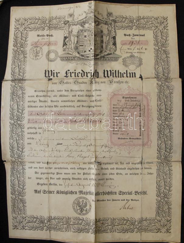 1846 Passport with 1/2Thaler 25gr Bayern + 30kr Austrian signetta. Many stamps on backside. In bad condition 35x49 cm