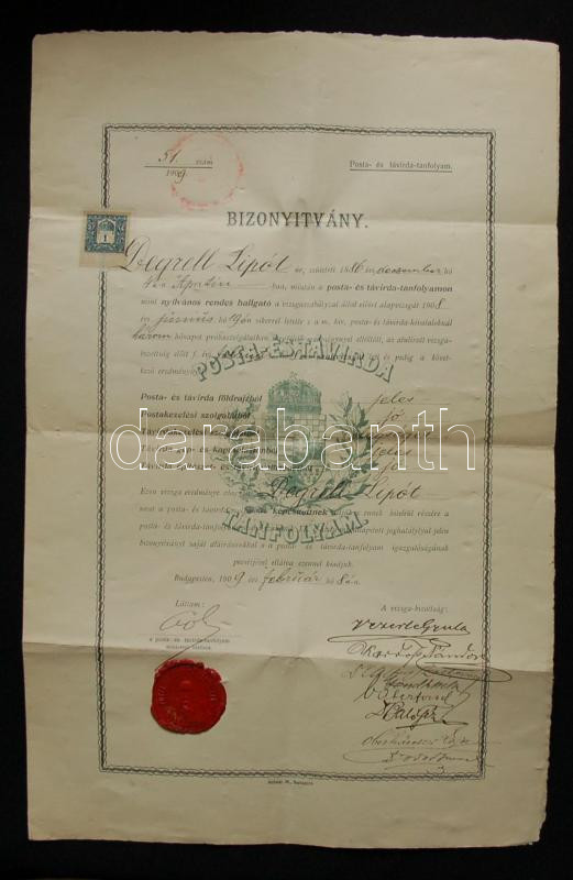 1909 Okmánybélyeggel, viasz pecséttel ellátott posta- és távirda tanfo... https://www.darabanth.com/de/158-Fernauktion/158.0/Andere-Sammelgebiete/Dokument~169/1909-Okmanybelyeggel-viasz-pecsettel-ellatott-posta-es-tavirda-tanfolyam-vizsgabizonyitvan~II500659