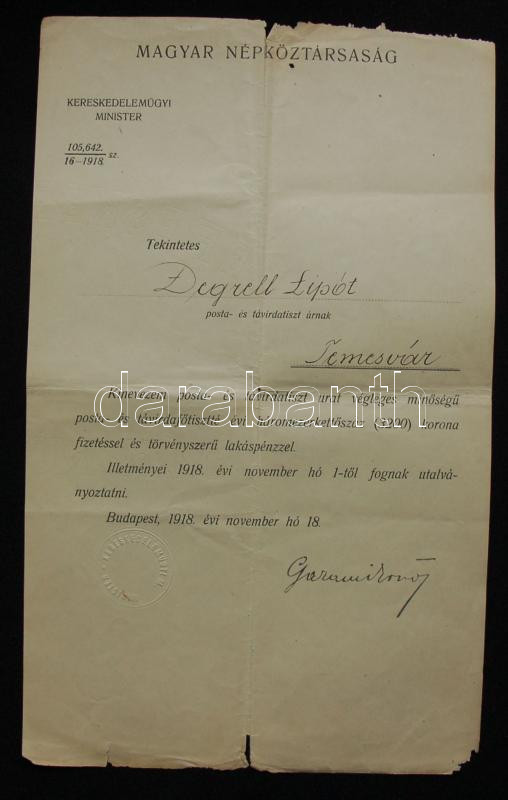 Beschreibung: 1918 Kinevezés posta- és táviridafőtisztté Temesváron, Garami Ernő aláírásával dombornyomott pecséttel ellátva