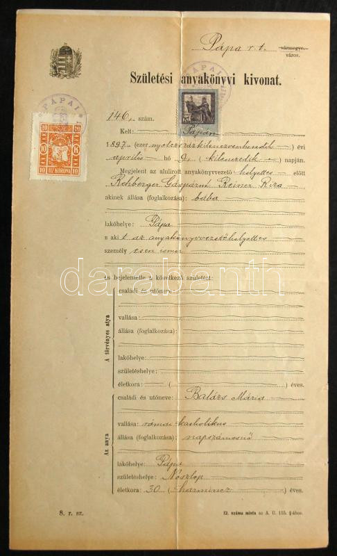 1921 Születési anyakönyvi kivonat okmánybélyeg + Pápa városi bélyeg ve... https://www.darabanth.com/de/158-Fernauktion/158.0/Andere-Sammelgebiete/Dokument~169/1921-Szuletesi-anyakonyvi-kivonat-okmanybelyeg-plus-Papa-varosi-belyeg-vegyes-lerovassal~II502752
