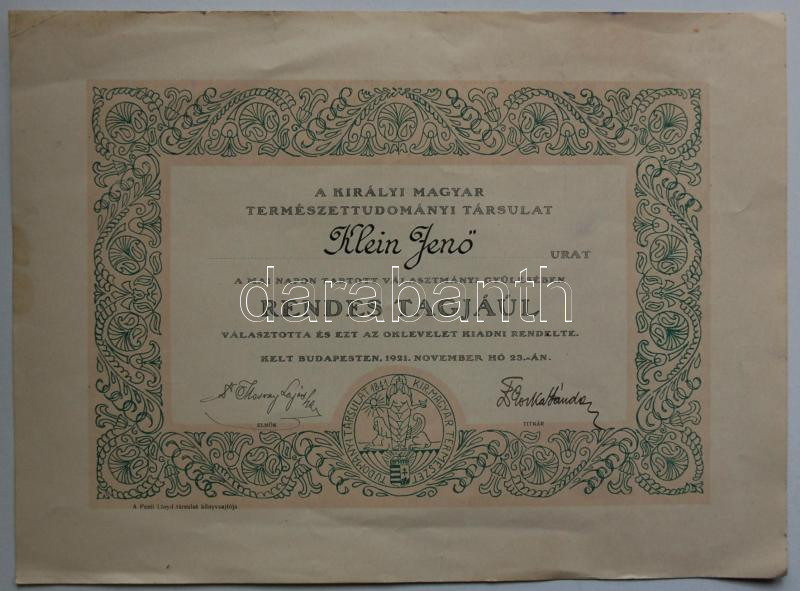 Beschreibung: 1921 november 23. A Királyi Magyar Természettudományi Társulat Klein Jenőt rendes tagjául választotta