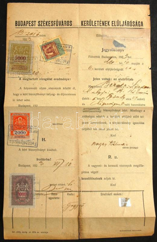 1923 Okmány okmánybélyeggel + Budapest városi okmánybélyegekkel https://www.darabanth.com/de/158-Fernauktion/158.0/Andere-Sammelgebiete/Dokument~169/1923-Okmany-okmanybelyeggel-plus-Budapest-varosi-okmanybelyegekkel~II502730