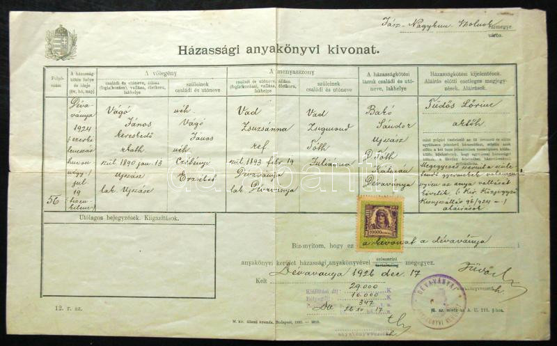 1926 Házassági anyakönyvi kivonat 10000K okmánybélyeggel https://www.darabanth.com/de/158-Fernauktion/158.0/Andere-Sammelgebiete/Dokument~169/1926-Hazassagi-anyakonyvi-kivonat-10000K-okmanybelyeggel~II502810