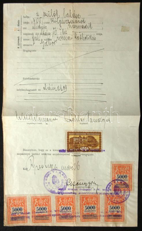 1926 Születési anyakönyvi kivonat 34000K Budapest városi okmánybélyegg... https://www.darabanth.com/de/158-Fernauktion/158.0/Andere-Sammelgebiete/Dokument~169/1926-Szuletesi-anyakonyvi-kivonat-34000K-Budapest-varosi-okmanybelyeggel~II502696