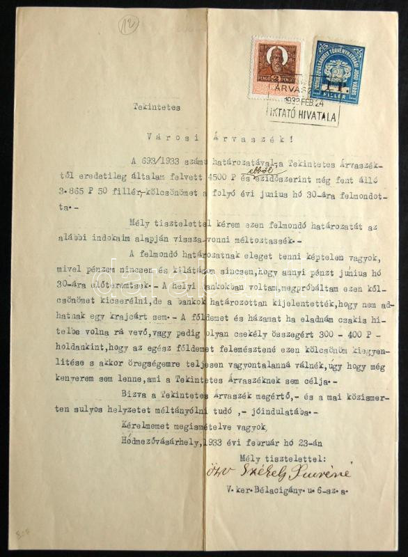 1933 Okmány okmánybélyeg és Hódmezővásárhely városi bélyeg vegyes lero... https://www.darabanth.com/de/158-Fernauktion/158.0/Andere-Sammelgebiete/Dokument~169/1933-Okmany-okmanybelyeg-es-Hodmezovasarhely-varosi-belyeg-vegyes-lerovassal~II502803