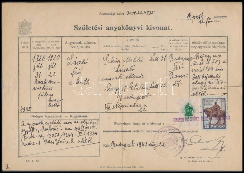 1941 Születési anyakönyvi kivonat 1P okmánybélyeggel + 2P Budapest vár... https://www.darabanth.com/de/158-Fernauktion/158.0/Andere-Sammelgebiete/Dokument~169/1941-Szuletesi-anyakonyvi-kivonat-1P-okmanybelyeggel-plus-2P-Budapest-varosi-okmanybelyeggel~II502683