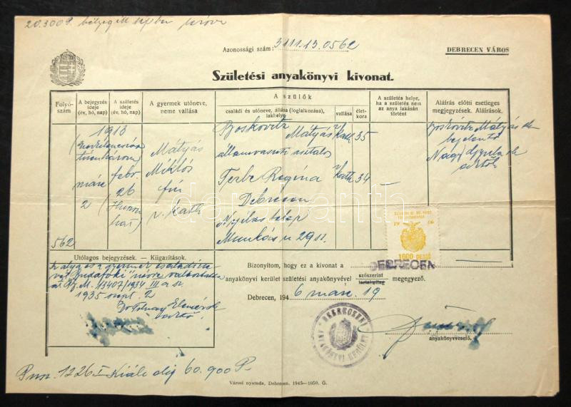 1946 Okmány okmánybélyeg + Debrecen városi bélyeg vegyes lerovással https://www.darabanth.com/de/158-Fernauktion/158.0/Andere-Sammelgebiete/Dokument~169/1946-Okmany-okmanybelyeg-plus-Debrecen-varosi-belyeg-vegyes-lerovassal~II502762