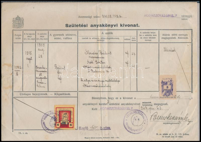 1947 Okmány okmánybélyeg + Hódmezővásárhely városi bélyeg vegyes lerov... https://www.darabanth.com/de/158-Fernauktion/158.0/Andere-Sammelgebiete/Dokument~169/1947-Okmany-okmanybelyeg-plus-Hodmezovasarhely-varosi-belyeg-vegyes-lerovassal~II502756