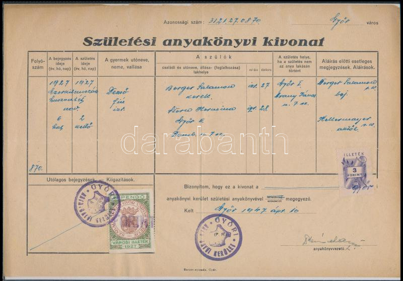 1947 Születési anyakönyvi kivonat illetékbélyeggel + Győr városi okmán... https://www.darabanth.com/de/158-Fernauktion/158.0/Andere-Sammelgebiete/Dokument~169/1947-Szuletesi-anyakonyvi-kivonat-illetekbelyeggel-plus-Gyor-varosi-okmanybelyeggel~II502681