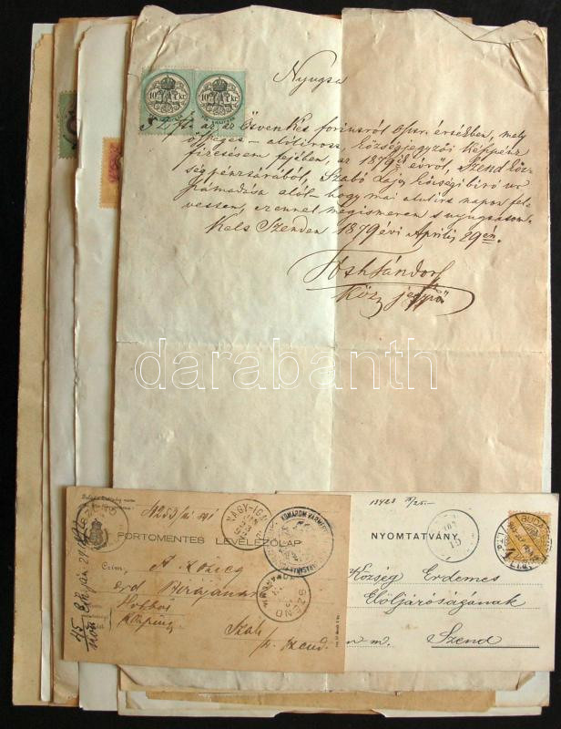 Beschreibung: Kis vegyes tétel: levelezőlapok, régi számlák, dokumentumok, nyomtatványok, levelek illetékbélyegekkel
