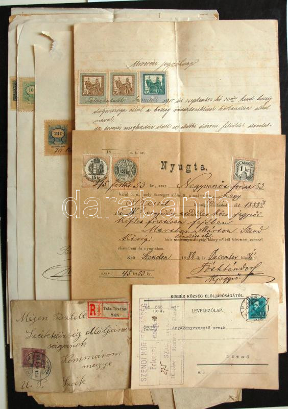 Beschreibung: Kis vegyes tétel: régi számlák, dokumentumok, nyomtatványok, levelek illetékbélyegekkel