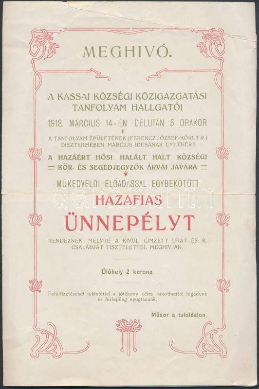 1918. Meghívó hazafias népünnepélyre. 26x17,5cm https://www.darabanth.com/de/158-Fernauktion/158.0/Andere-Sammelgebiete/Drucksachen~600021/1918-Meghivo-hazafias-nepunnepelyre-26x17-5cm~II499775
