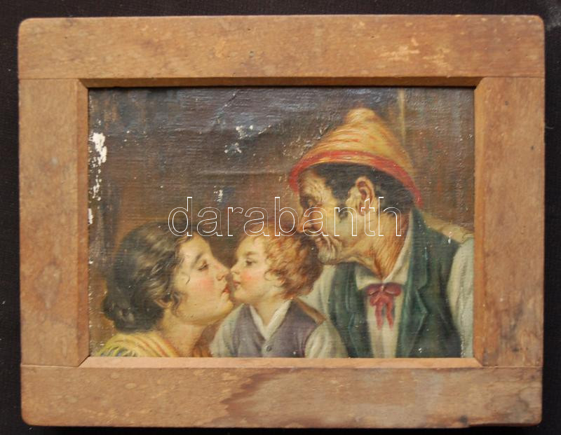 Beschreibung: Családi portré érdekes zártechnikájú fa- fém keretben, olaj- vászon, 16,5x25 cm
