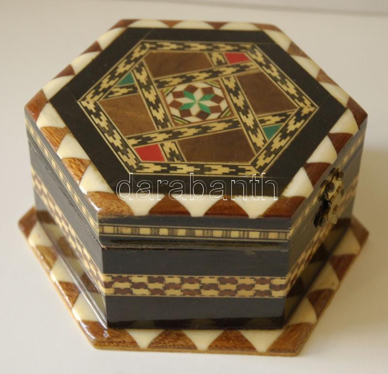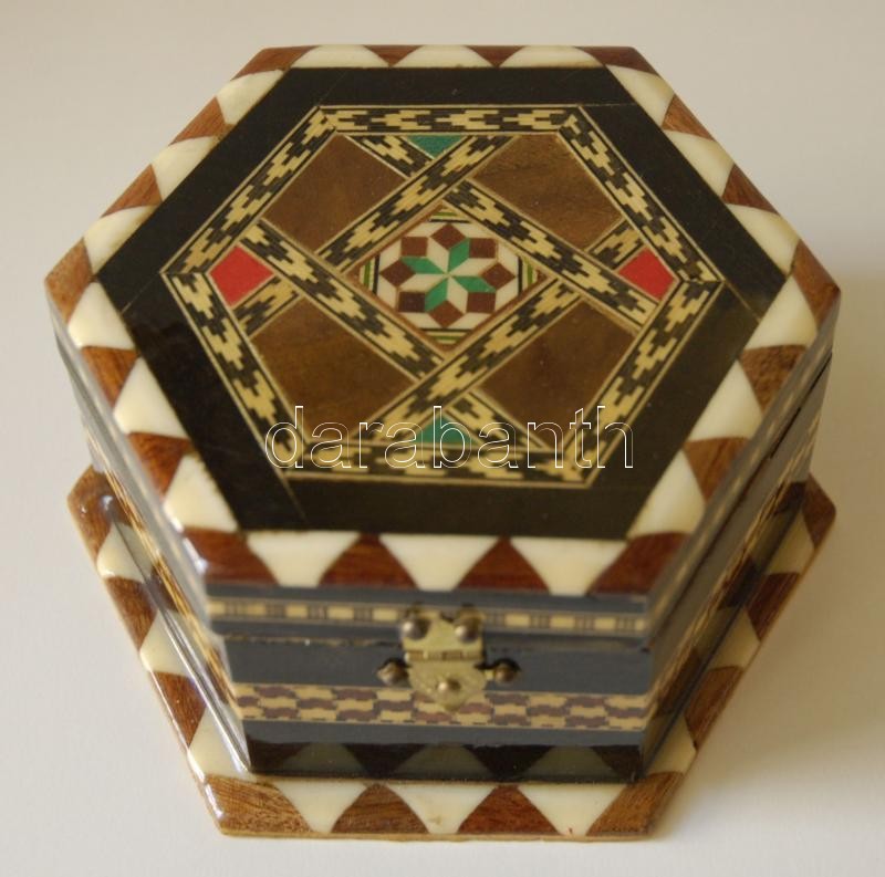 Beschreibung: Lakkozott, színes geometriai mintával díszített intarziás hatszögletű fa ékszeres doboz /