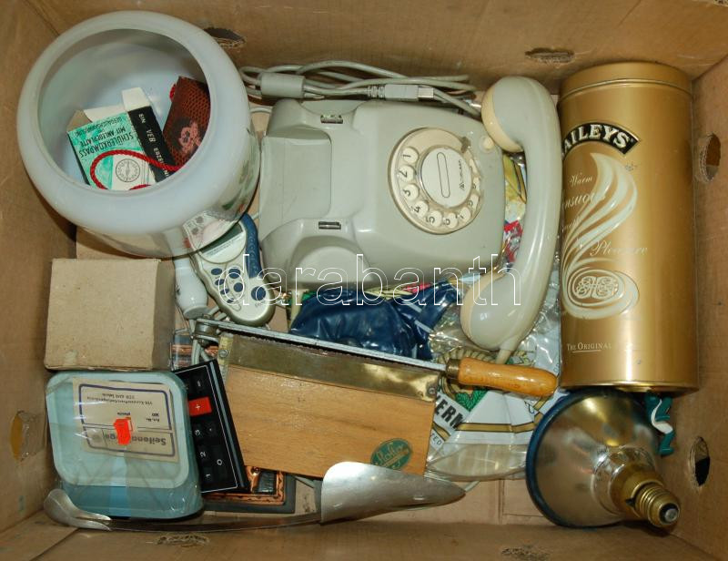 Beschreibung: Nagy vegyes bolhapiac tétel: régi telefon, fémdobozok, sámfa, számológép, különleges formájú boros üveg, stb.